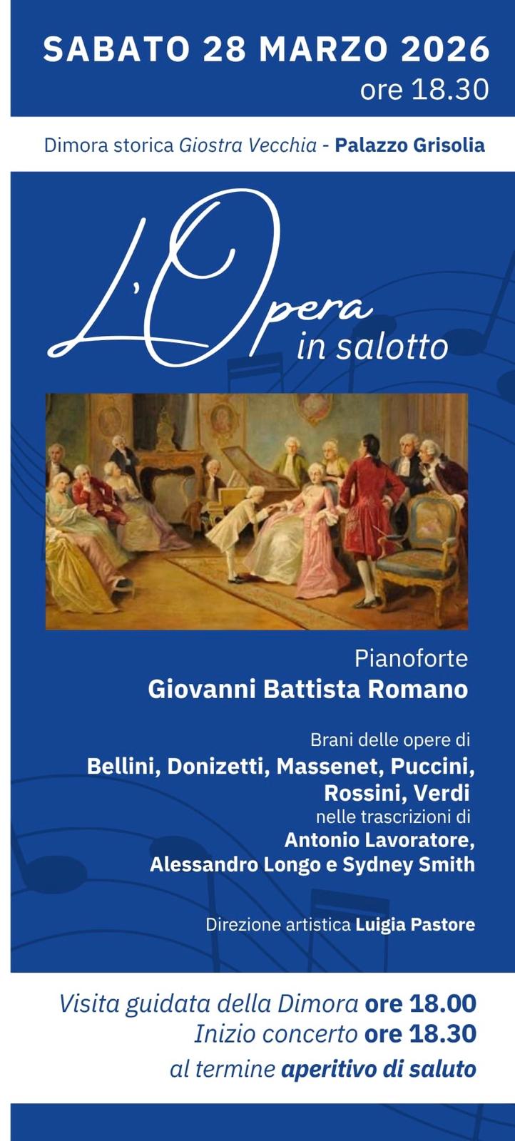 COSENZA :: 26/03/2026 :: Prosegue con crescente attenzione la rassegna “L’Opera in salotto”, promossa dall’Associazione culturale Polimnia, che si conferma tra le iniziative più originali e suggestive del panorama culturale locale. Il prossimo appuntamento è in programma sabato 28 marzo 2026, nella raffinata cornice della Dimora storica Giostra Vecchia – Palazzo Grisolia di Cosenza, luogo simbolo di eleganza e memoria, capace di trasformarsi in un vero e proprio salotto musicale.