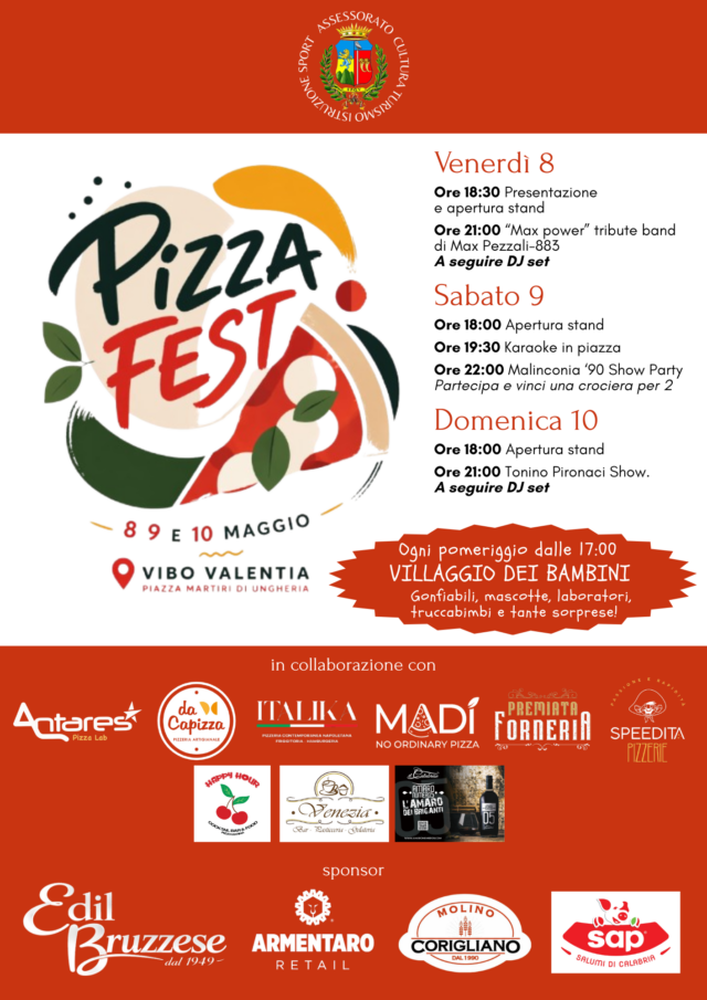 VIBO VALENTIA :: 23/04/2026 :: Il Comune di Vibo Valentia è lieto di presentare la prima edizione del “Pizza Fest”, una tre giorni dedicata alla pizza, alla socialità e alla valorizzazione delle eccellenze gastronomiche locali. L’iniziativa, sostenuta dall’amministrazione comunale con l’assessorato alla Cultura e al Turismo, animerà il centro cittadino con degustazioni, musica e attività per famiglie e visitatori, nel weekend dell’8, 9 e 10 maggio prossimi.