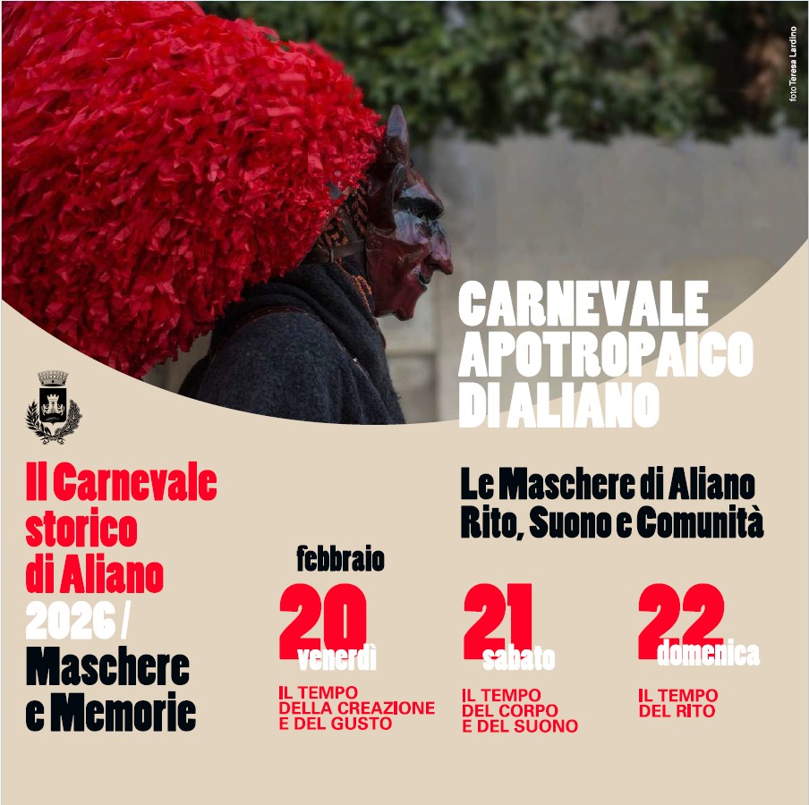 ALIANO :: 20/02/2026 :: Prende il via oggi ad Aliano una tre giorni di festeggiamenti in occasione del Carnevale Apotropaico, un evento che unisce tradizione, arte e comunità in un percorso di comunità. Madrina dell’edizione 2026 sarà la conduttrice Rai Bianca Luna Santoro, presenza simbolica e narrativa dell’intero programma. Sotto la direzione artistica di Peppone Calabrese, e la collaborazione con Franco Arminio direttore artistico de “ La luna ai calanchi”, il comune di Aliano propone un viaggio esperienziale che attraversa il gusto e la musica con protagonista la maschera cornuta, patrimonio culturale lucano in dialogo con il presente. La giornata si apre a palazzo Scardaccione con un laboratorio di cucina tradizionale dedicato ai bambini: pane, dolci rituali, pasta fatta a mano e racconti sui riti apotropaici del Carnevale lucano. Nel pomeriggio, al “Laboratorio Balzano”, prende forma la costruzione delle maschere cornute. Alle ore 18:00, presso l’Auditorium dei Calanchi, inaugurazione ufficiale del Carnevale con gli interventi di Peppone Calabrese, Luigi De Lorenzo e Franco Arminio, presentati da Bianca Luna Santoro. A seguire, concerto di Musicamanovella & Agostino Gerardi e spettacolo teatrale La Frase – Commedia improvvisata. Domani, sabato 21 febbraio, i centro storico ospita il laboratorio di musica popolare e ritmi rituali a cura di Pino Gala e Tiziana Miniati. Dopo il momento conviviale a palazzo Scardaccione, il pomeriggio è dedicato al completamento delle maschere, al trucco rituale e alla sfilata. In serata, conferenza Le feste del popolo con Pino Gala e concerto in Piazza San Luigi Gonzaga con Gli Amarimai. La giornata di domenica inizia con la vestizione collettiva delle maschere e la grande sfilata del Carnevale Storico di Aliano. Nel pomeriggio, all’auditorium dei Calanchi, la conferenza “Maschere , dalle comunità patrimoniali locali alla dimensione europea” con Antonella D’Auria, seguita dallo spettacolo speciale “Cin Cin incontro con il vino, da Noè a Giacomo Tachis” di e con Antonio Petrocelli, presentato dalla madrina del Carnevale Bianca Luna Santoro. Gran finale in piazza San Luigi Gonzaga con la “Festa del petrosello e la tradizionale rottura delle pignatte”. “Siamo orgogliosi di inaugurare il Carnevale Apotropaico di Aliano, un evento che unisce tradizione, arte e comunità in un percorso di condivisione e solidarietà – spiega Luigi De Loreno, sindaco di Aliano – la nostra comunità si prepara a vivere tre giorni di festa, con la partecipazione di artisti, musicisti e cittadini, per celebrare la nostra cultura e la nostra identità. La maschera cornuta, patrimonio culturale lucano, sarà la protagonista di questo viaggio esperienziale che attraversa il gusto e la musica. Siamo felici di accogliere la conduttrice Rai Bianca Luna Santoro come madrina dell’edizione 2026 e di collaborare con Peppone Calabrese e Franco Arminio per creare un programma ricco di eventi e iniziative. Il Carnevale di Aliano non è solo una festa, ma un rito collettivo che ci unisce e ci fa sentire parte di una comunità”. Per info www.carnevalestoricoaliano.it