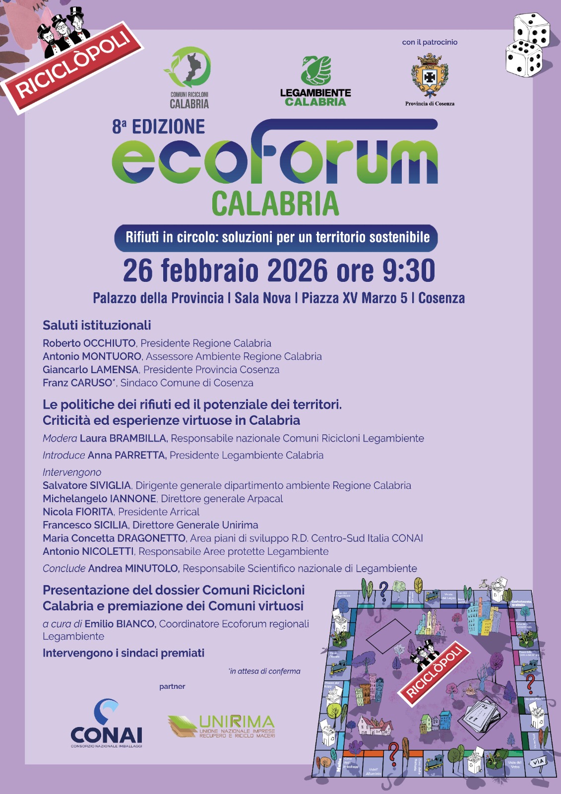 COSENZA :: 20/02/2026 :: Si terrà giovedì 26 febbraio 2026, a partire dalle ore 9:30, nella Sala Nova del Palazzo della Provincia di Cosenza (Piazza XV Marzo, 5), l’8ª edizione di Ecoforum Calabria, appuntamento regionale dedicato alle politiche di gestione dei rifiuti e alle strategie per uno sviluppo sostenibile dei territori.