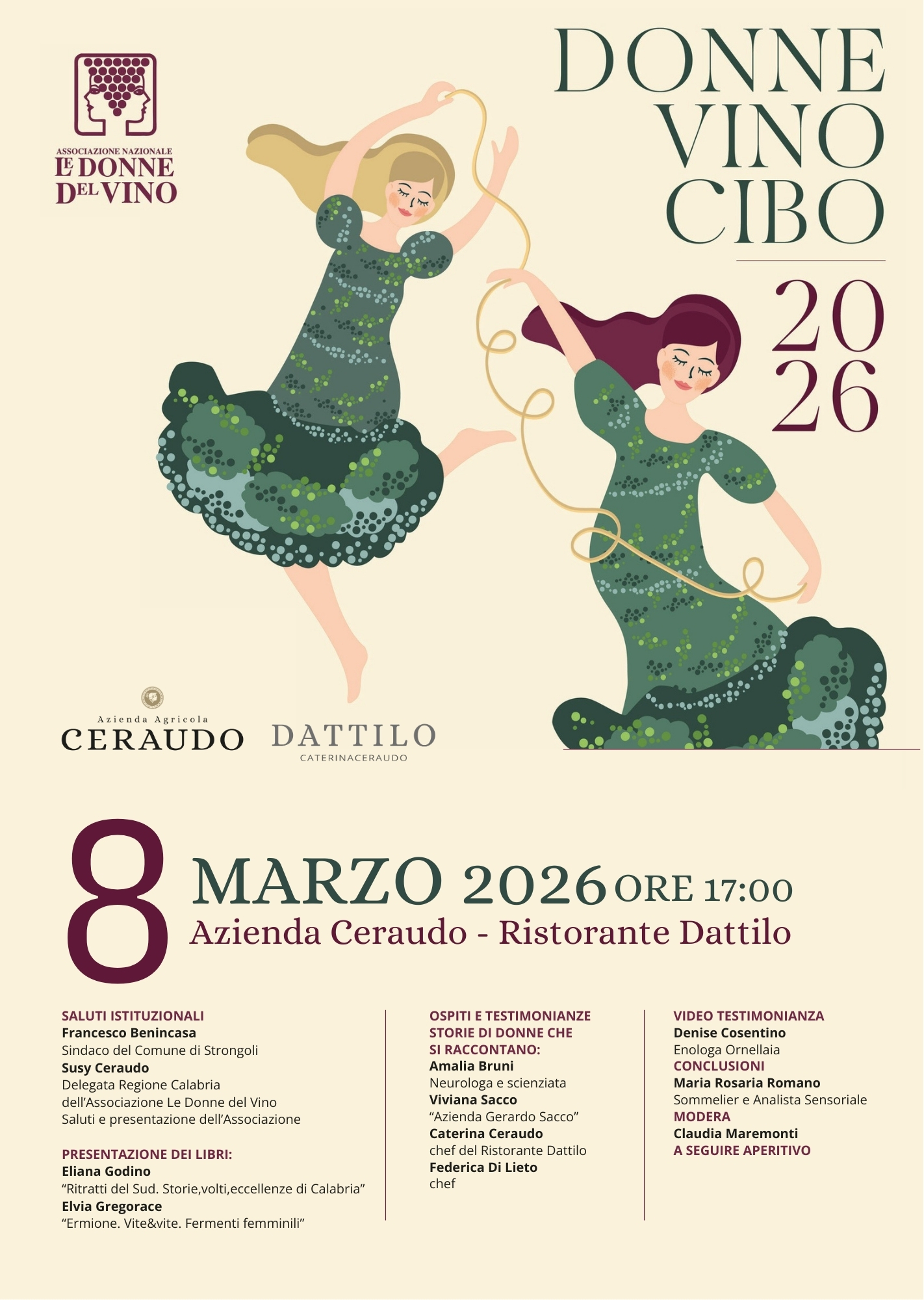 STRONGOLI :: 05/03/2026 :: Donne, vino e cultura al centro dell’iniziativa in programma l’8 marzo 2026 alle ore 17:00 all’Azienda Ceraudo – Ristorante Dattilo, in occasione della Giornata internazionale della donna. L’evento, promosso dall’Associazione nazionale Le Donne del Vino, metterà insieme testimonianze, presentazioni di libri e interventi di protagoniste del mondo della scienza, della cultura e della gastronomia. La partecipazione è esclusivamente su invito.